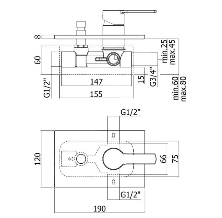 Eengreeps inbouw douchekraan met inbouwdeel en omstelling.